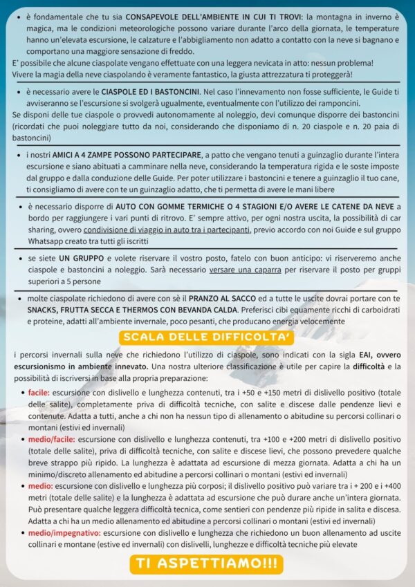 Possibilità di noleggio ciaspole e bastoncini, su prenotazione anticipata al momento dell’iscrizione.